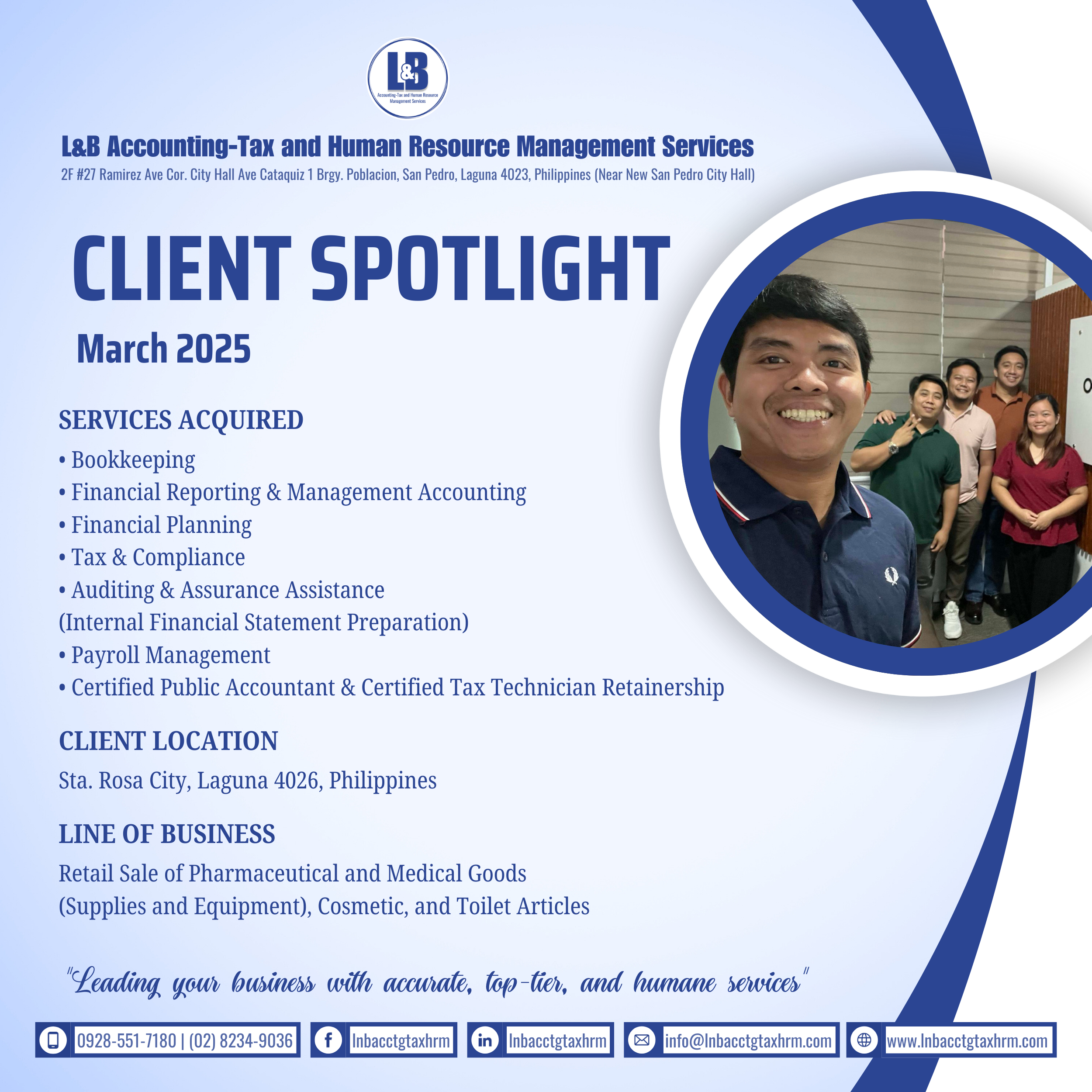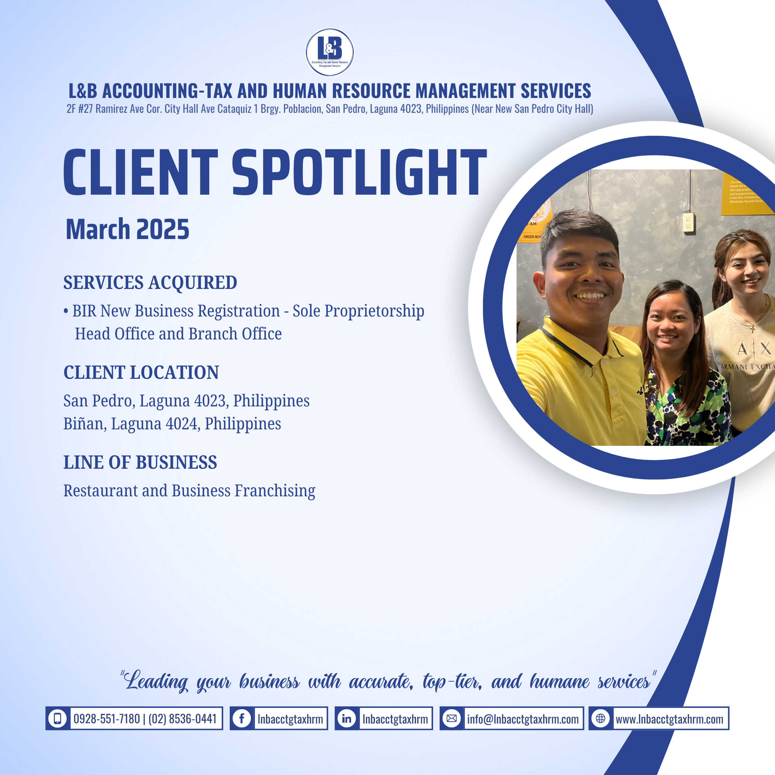Founded in 2025, L&B Accounting-Tax and Human Resource Management Services began with a simple yet ambitious mission: to help businesses achieve financial clarity and operational efficiency. Starting as a dedicated accounting and tax consultancy, we quickly gained recognition for our precision, reliability, and client-centered approach.